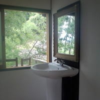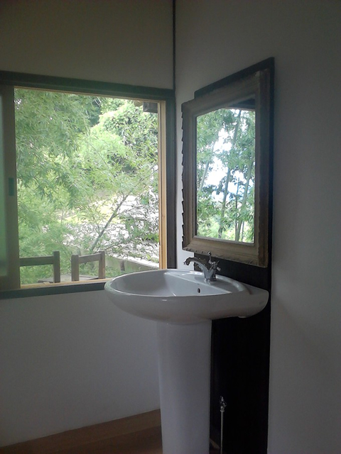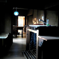 ホーローシンクにネズコの板壁、ミカゲ石の床と腰壁。